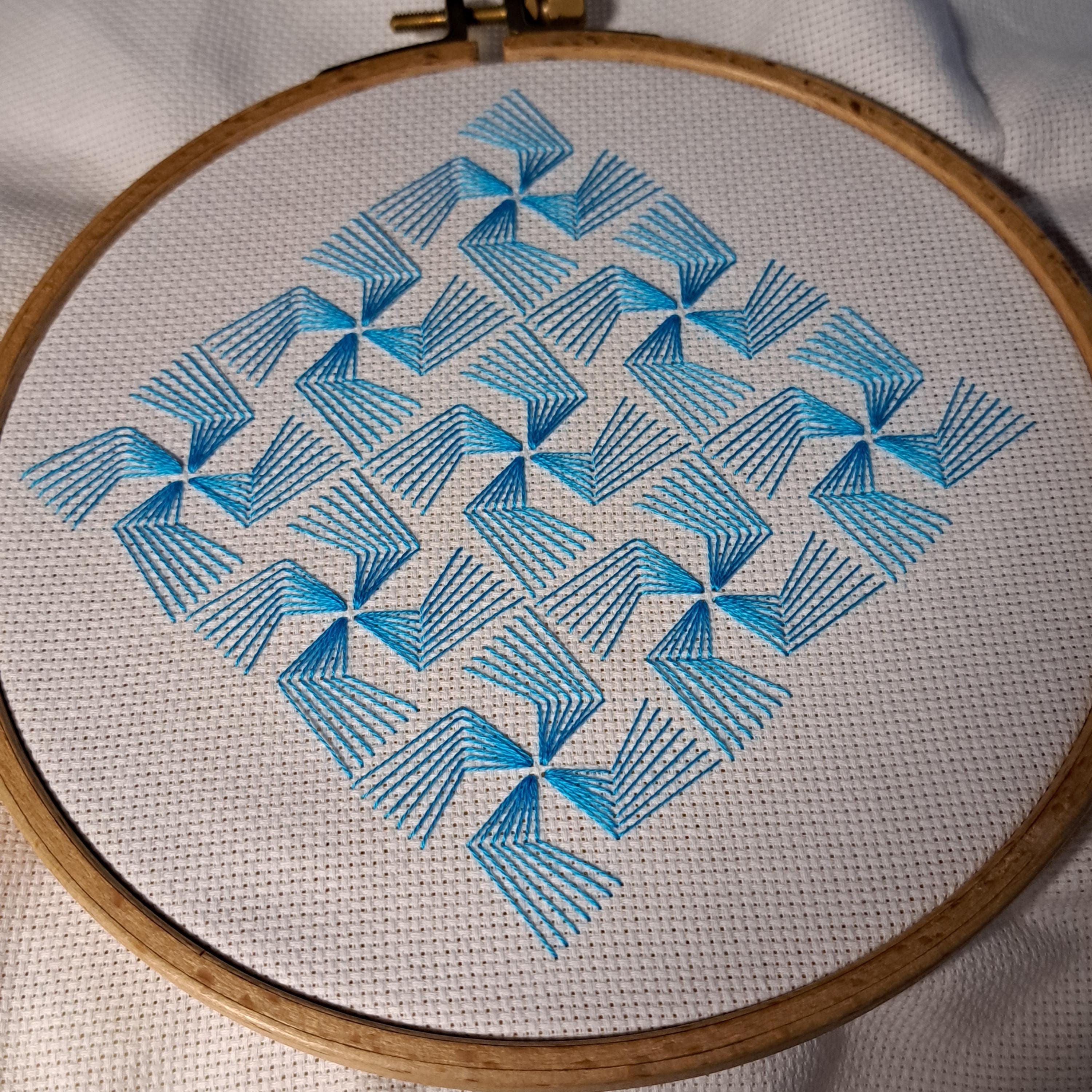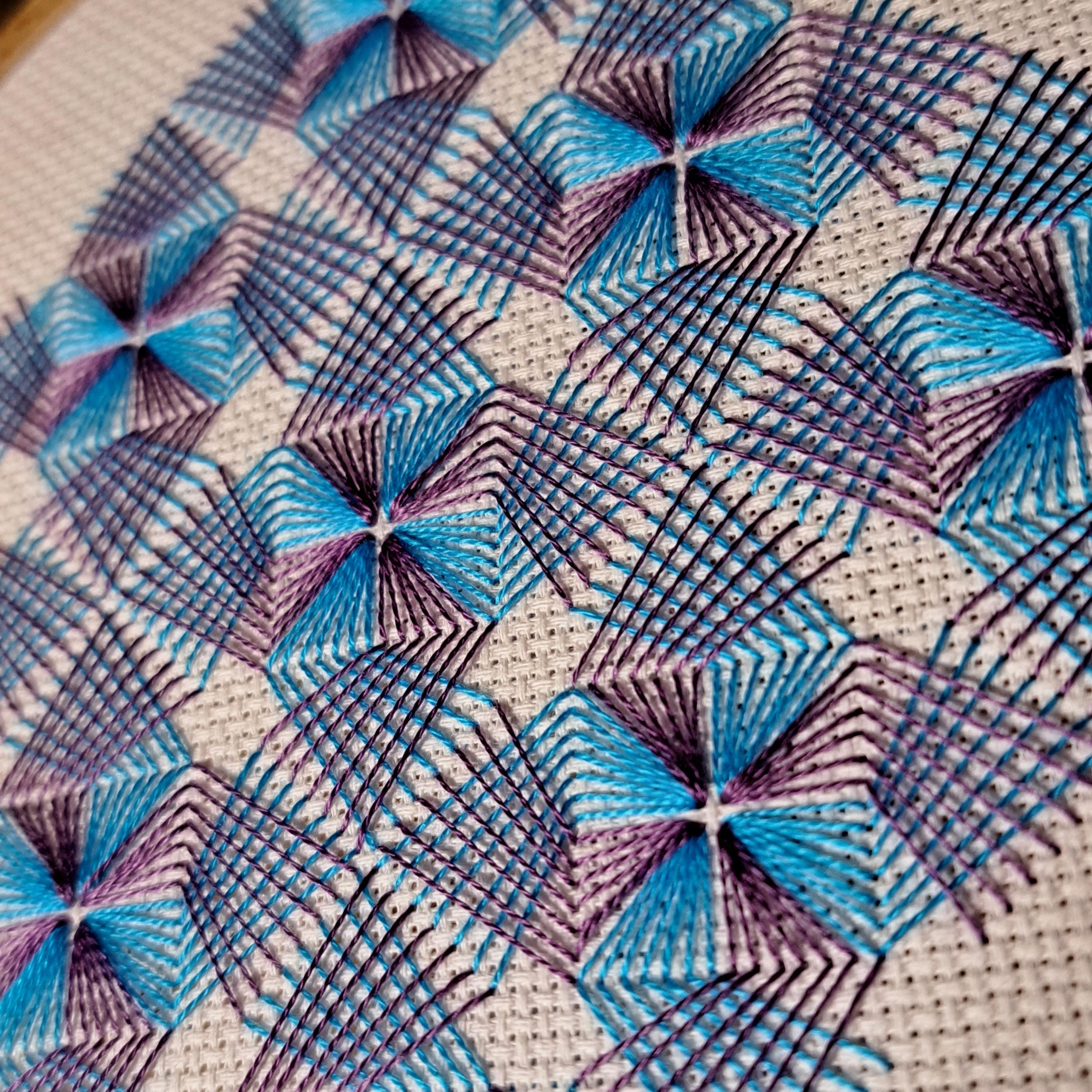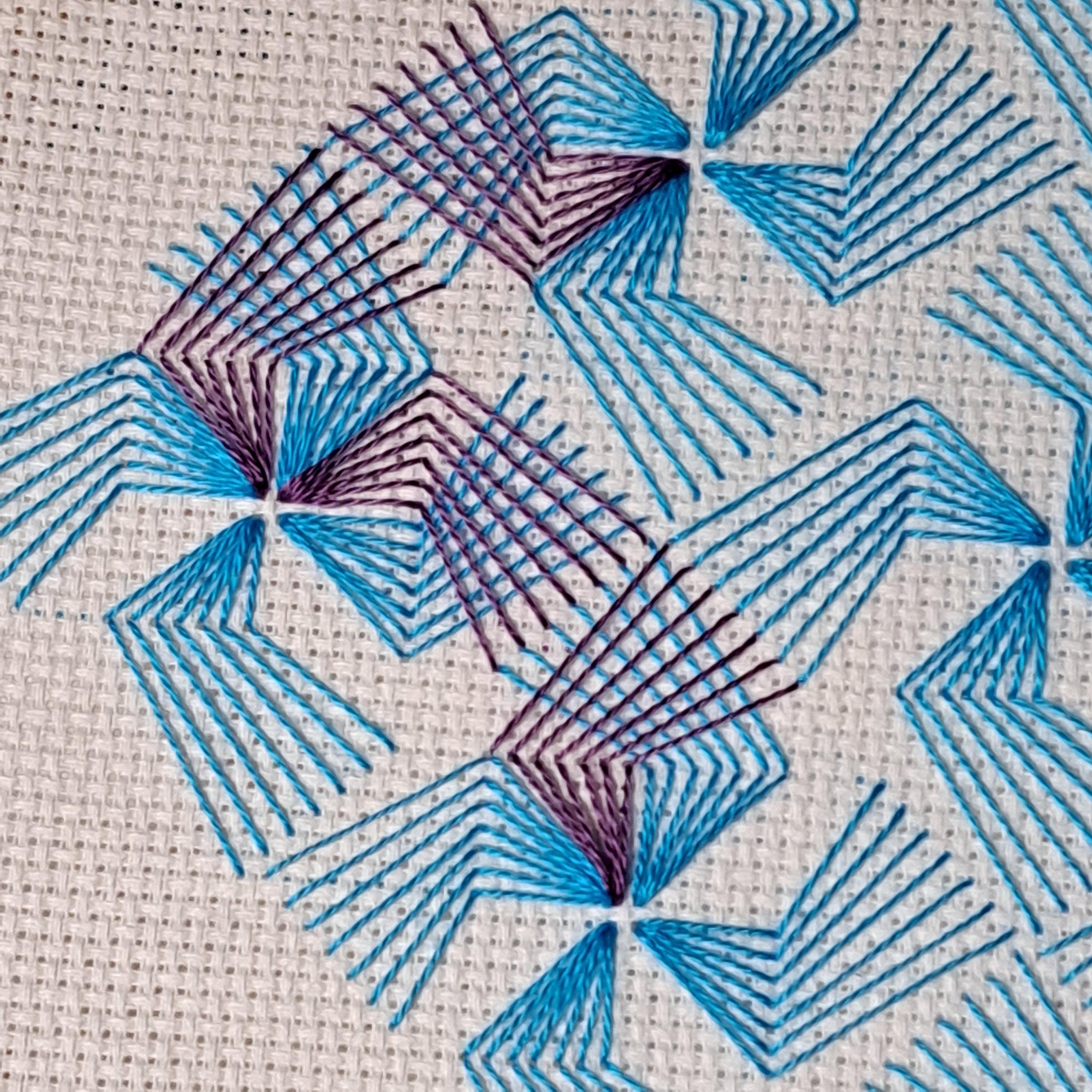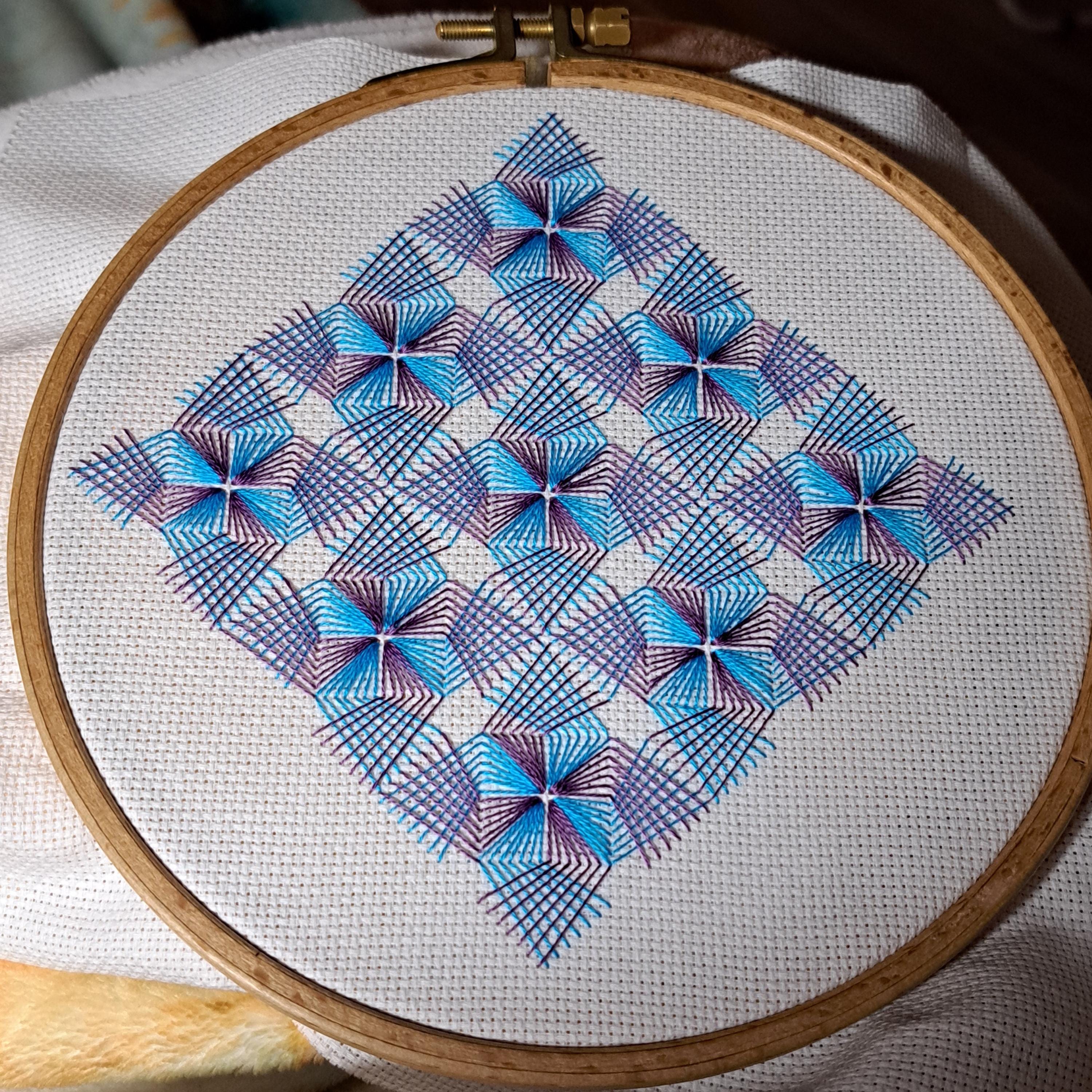 That's really wow. The pattern in that color combination. Violet and turquoise. I had to embroider it myself. So beautiful. You can see it in the photos. The pattern is stitched in two parts, so the second color is partially stitched over the first. So, you're always stitching long threads. It's best to use an embroidery frame that fits the entire pattern. I did that, and it really helps with the stitching.