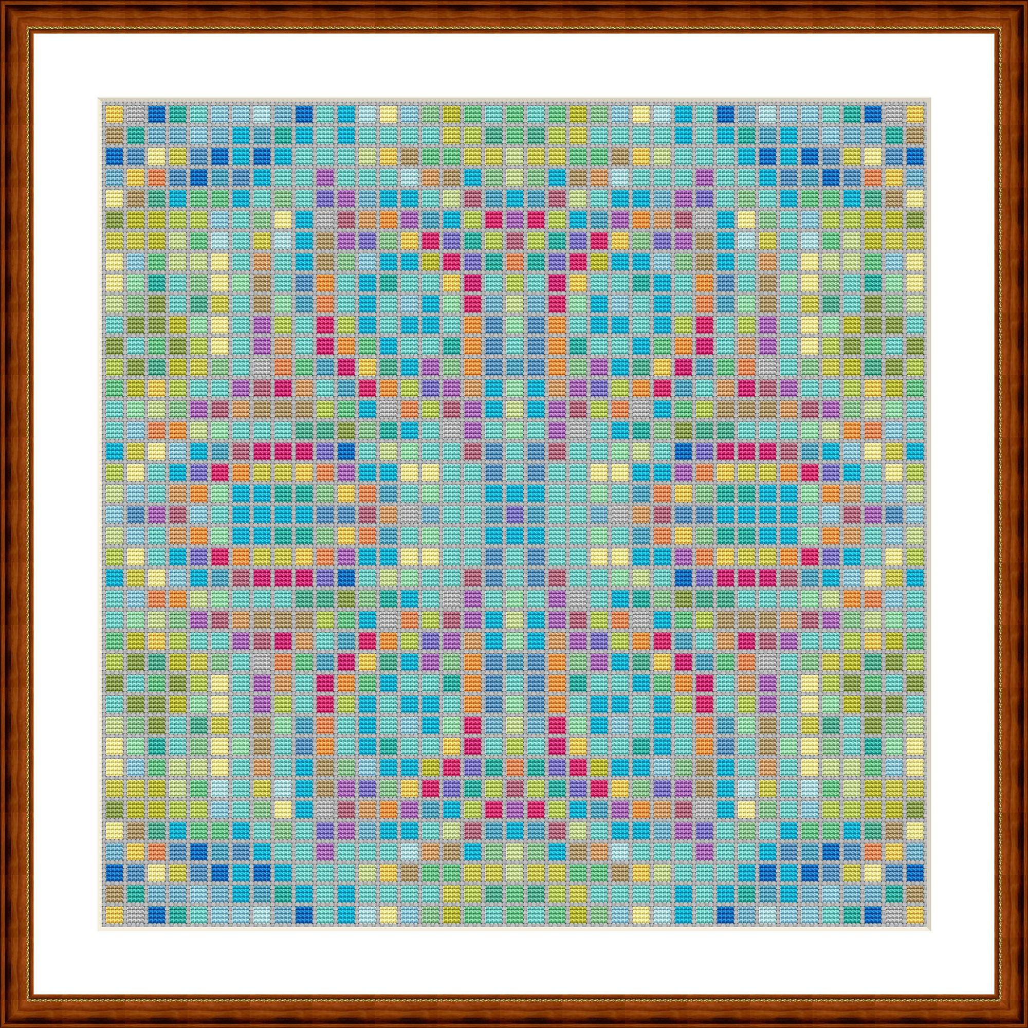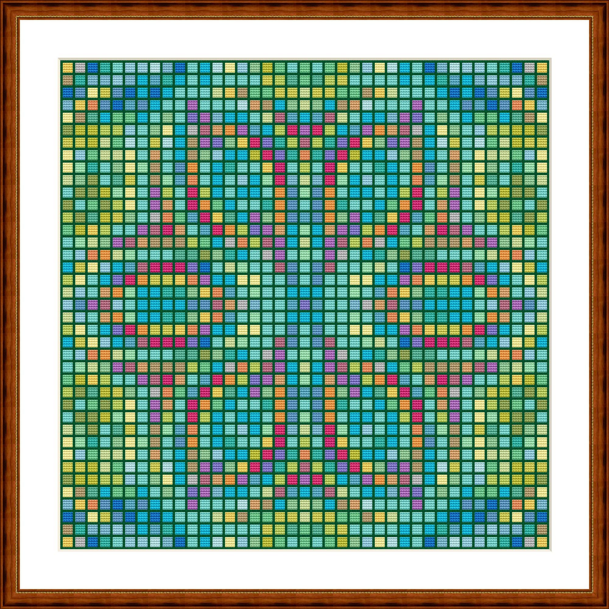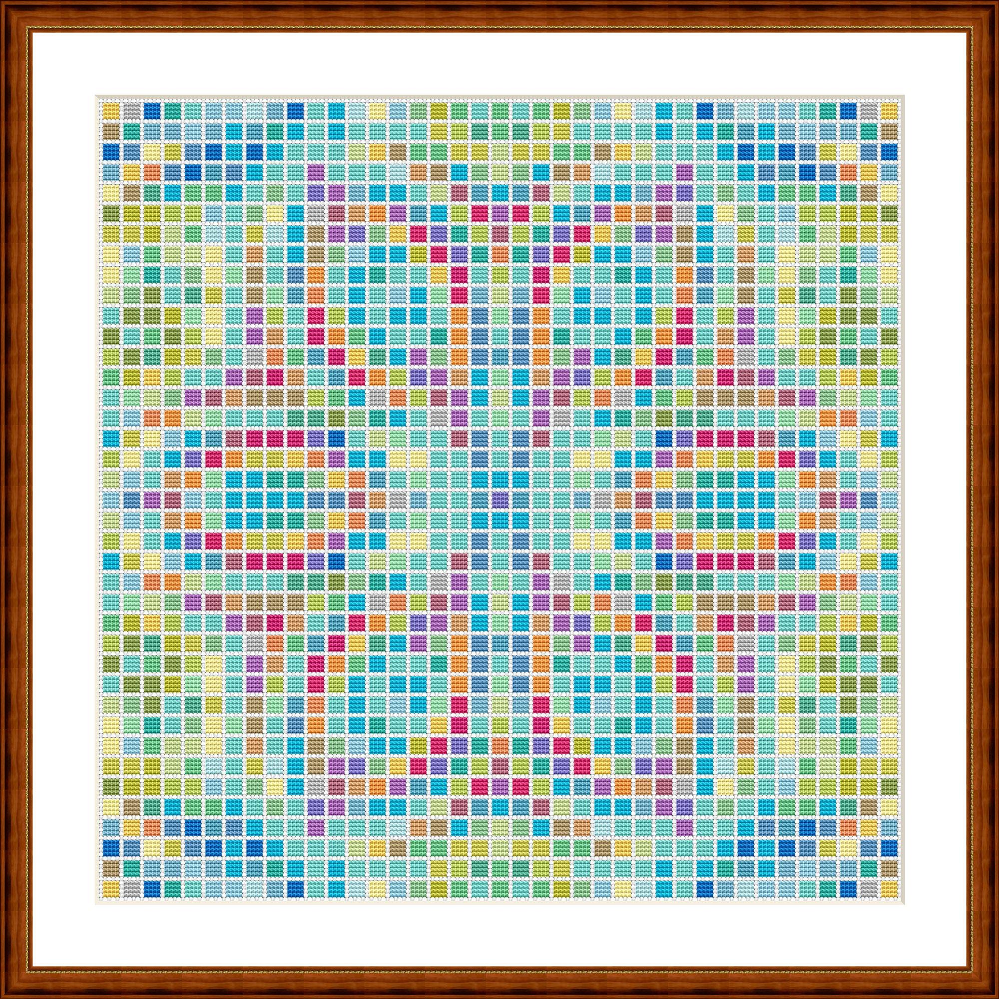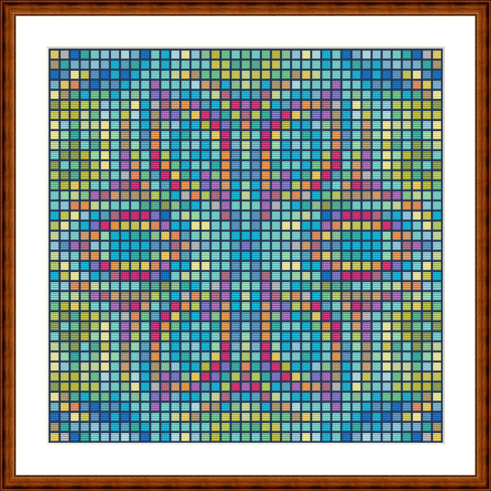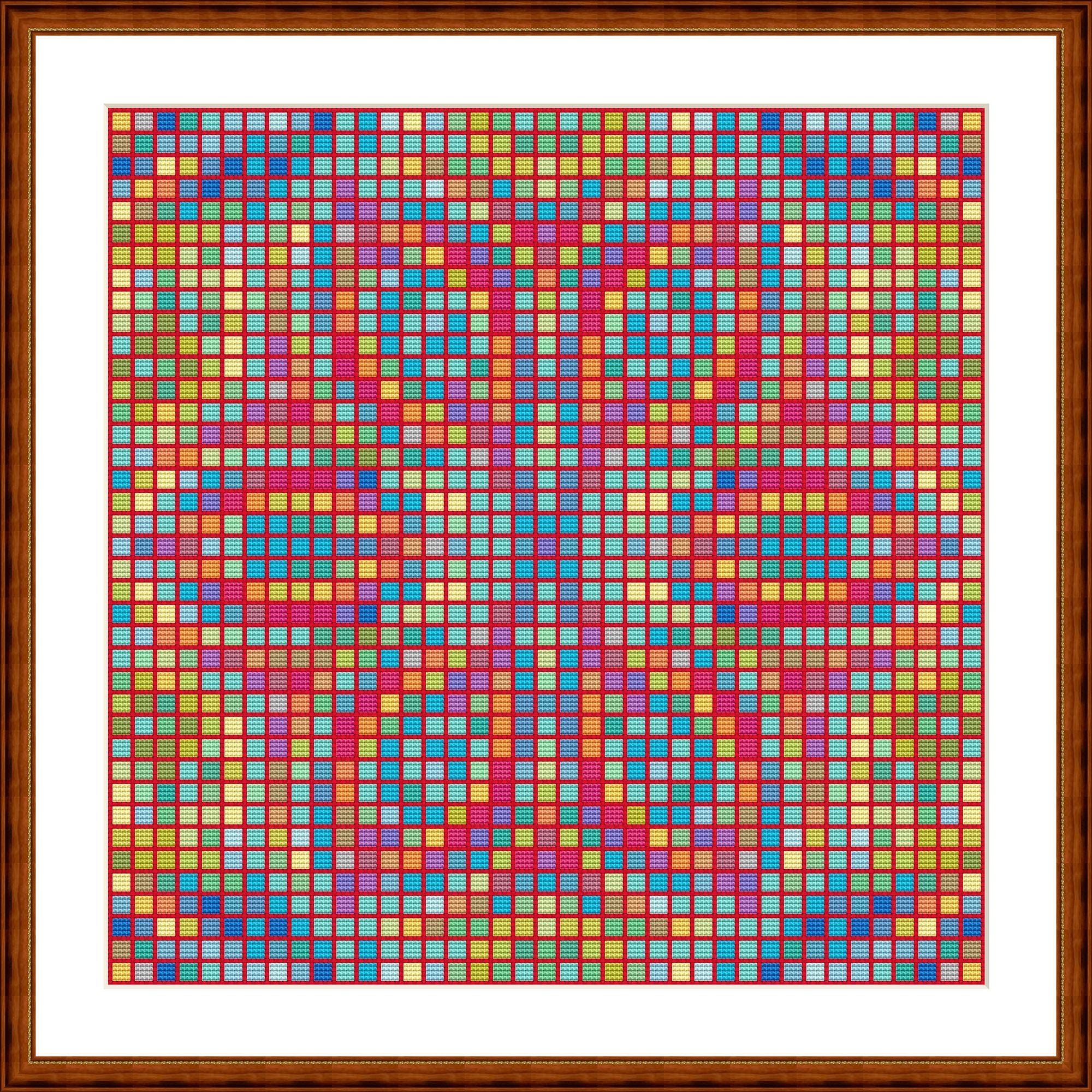 Cross-stitch mosaic. Each mosaic consists of 4x4 cross stitches. Space is left around the edges for a cross stitch or for fabric color. It's amazing what a difference the fabric color makes. You can also stitch the spaces with a color of your choice. Whatever you like best.
