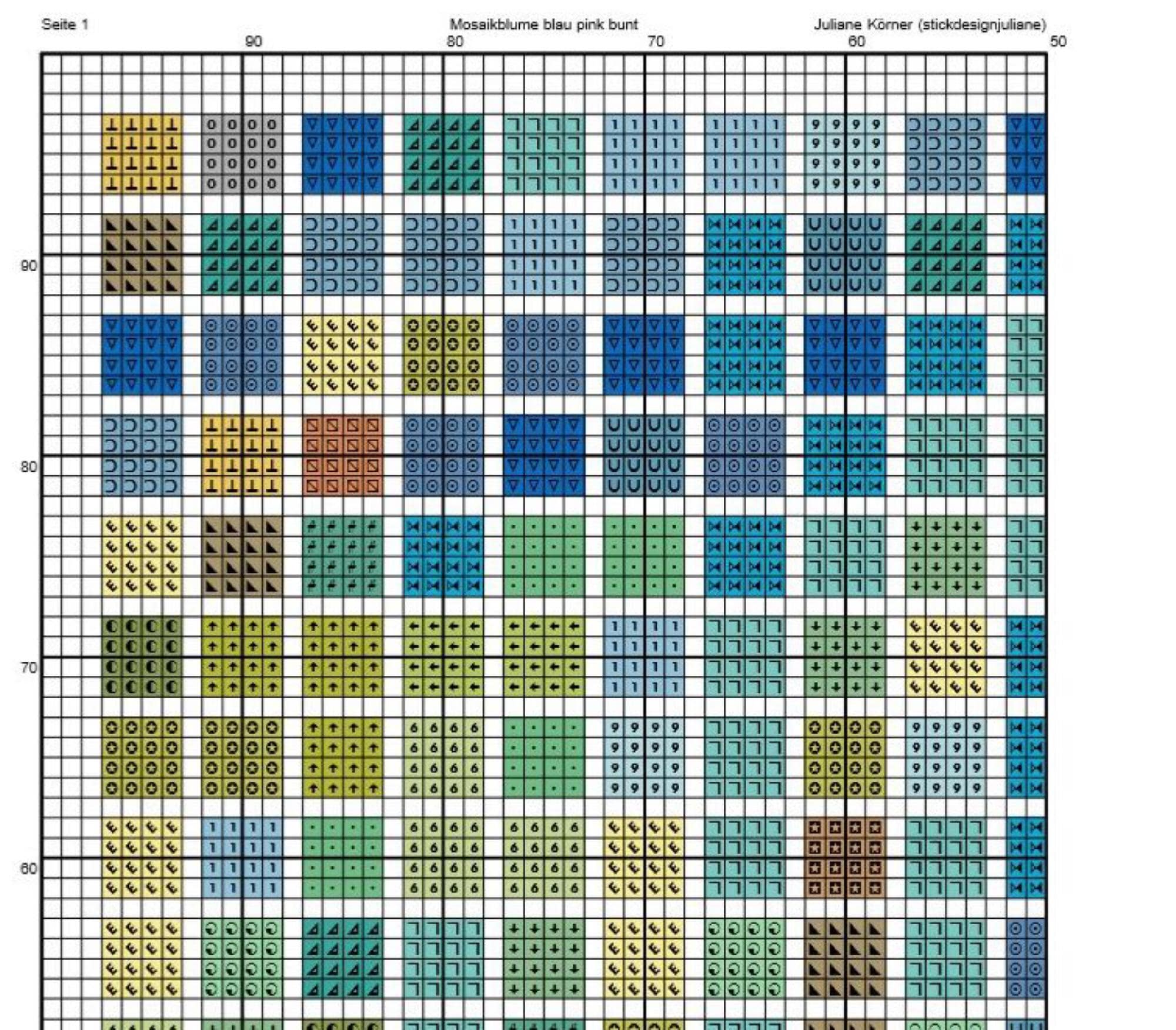 Cross stitch pattern mosaic flower blue pink, image size approx. 30 x 30 cm, cross stitch embroidery pattern PDF file instant download
