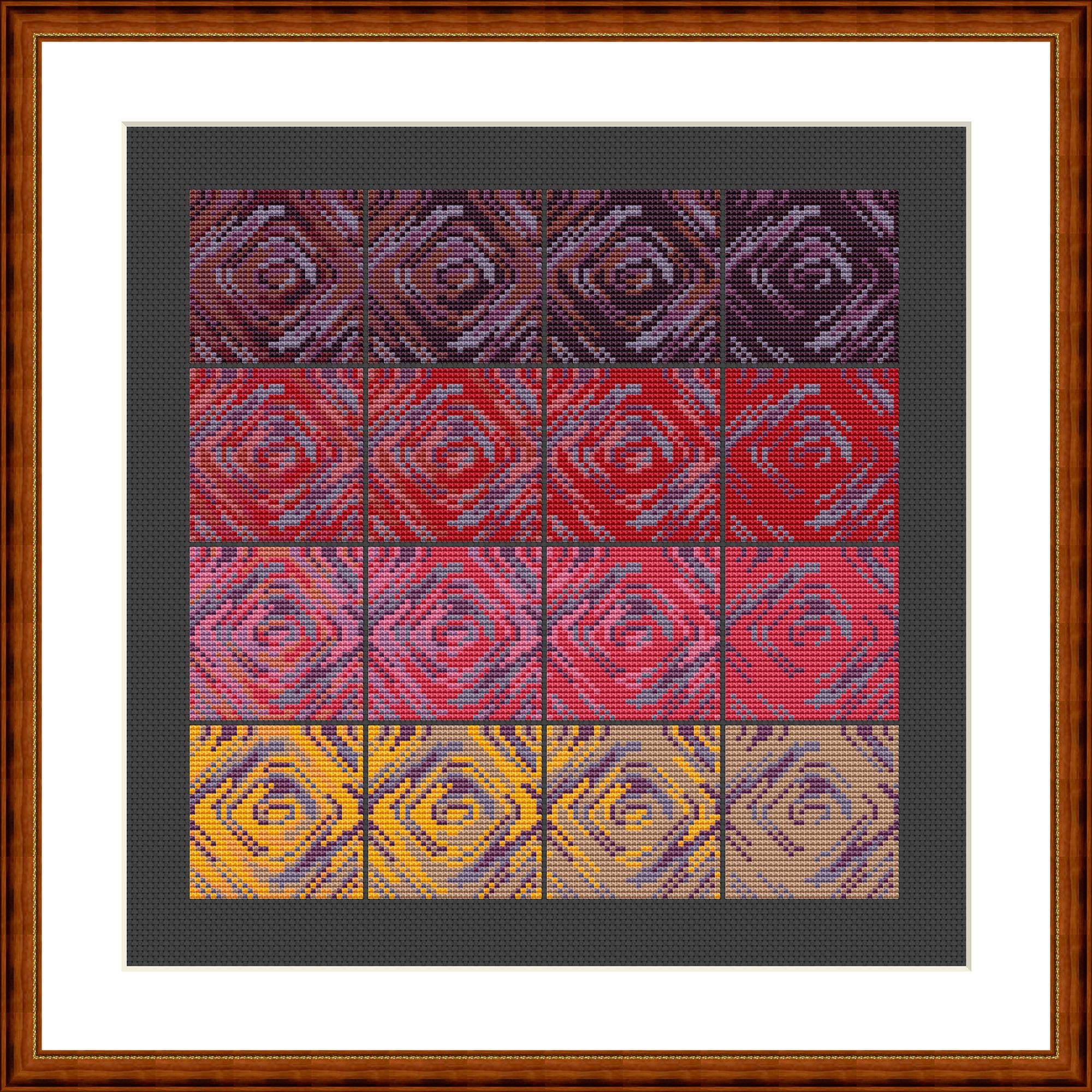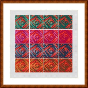 It's so fascinating to see how a pattern can change. Changing the color or decreasing the number of colors transforms the image. The result is a captivating sampler. Very decorative. The squares are each 33 x 33 cross stitches.