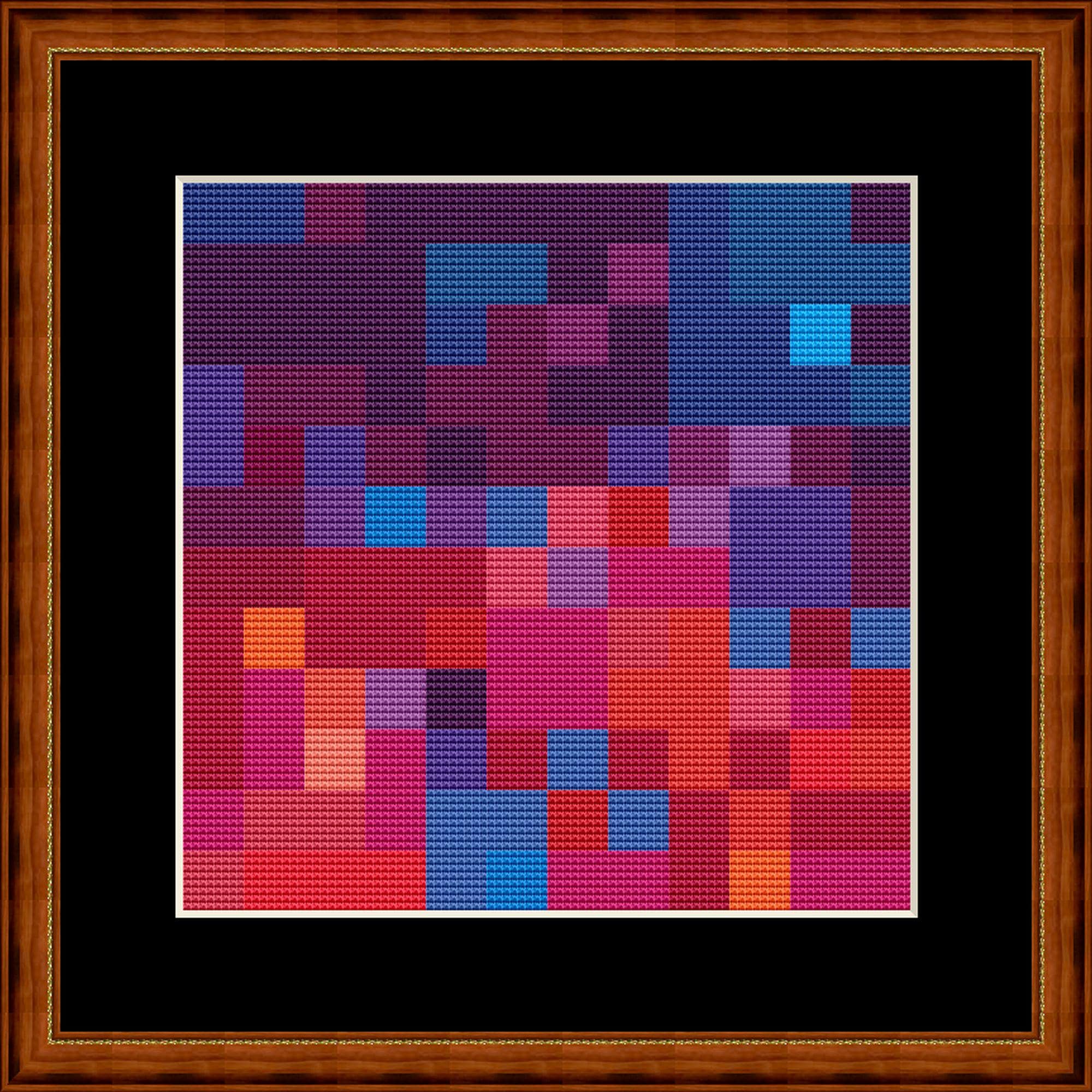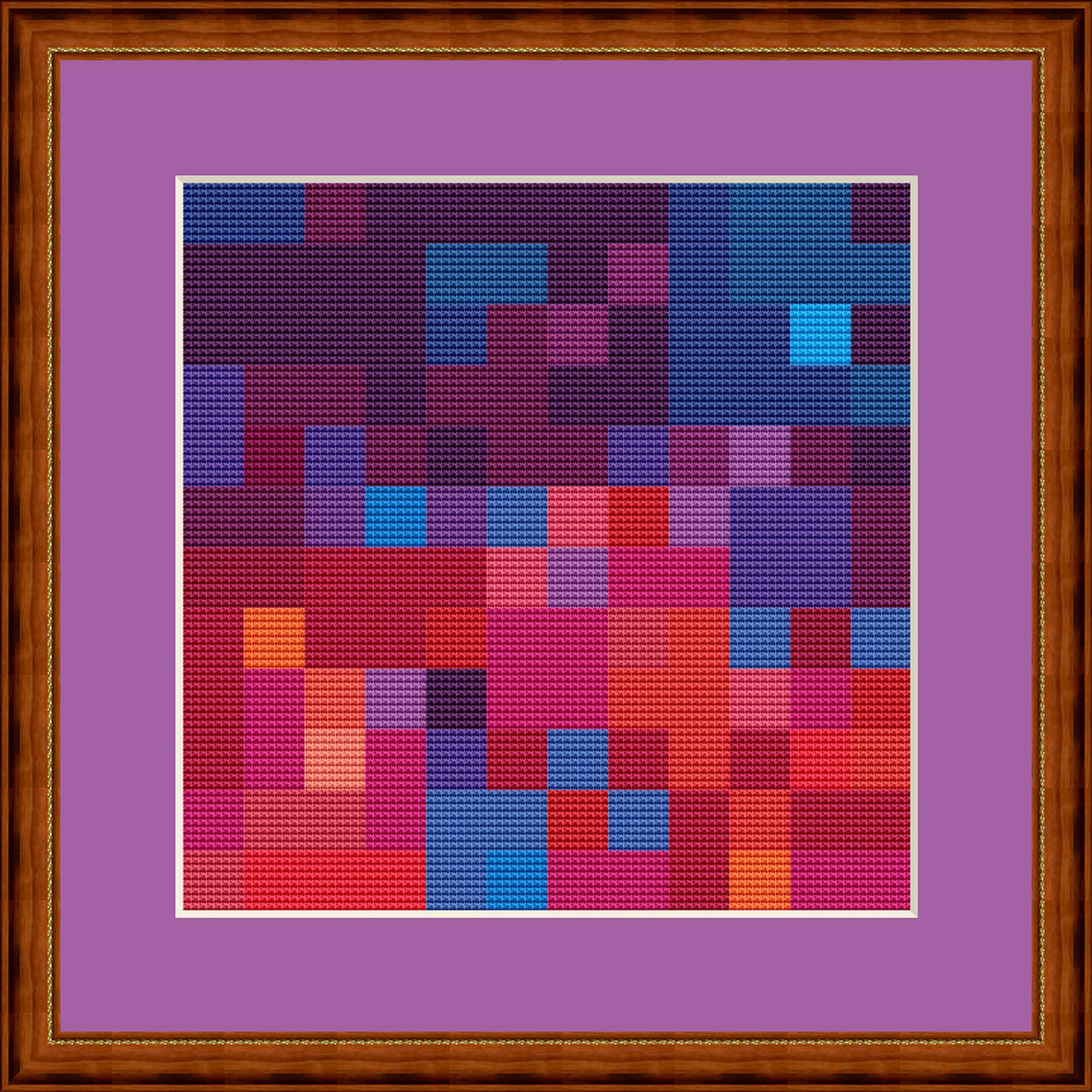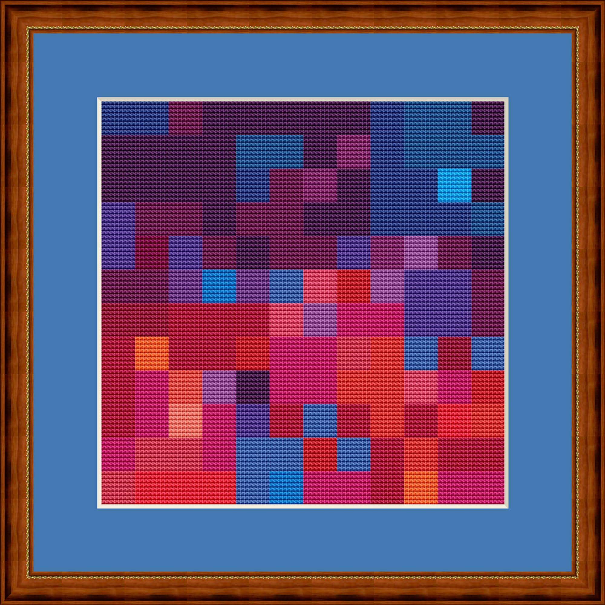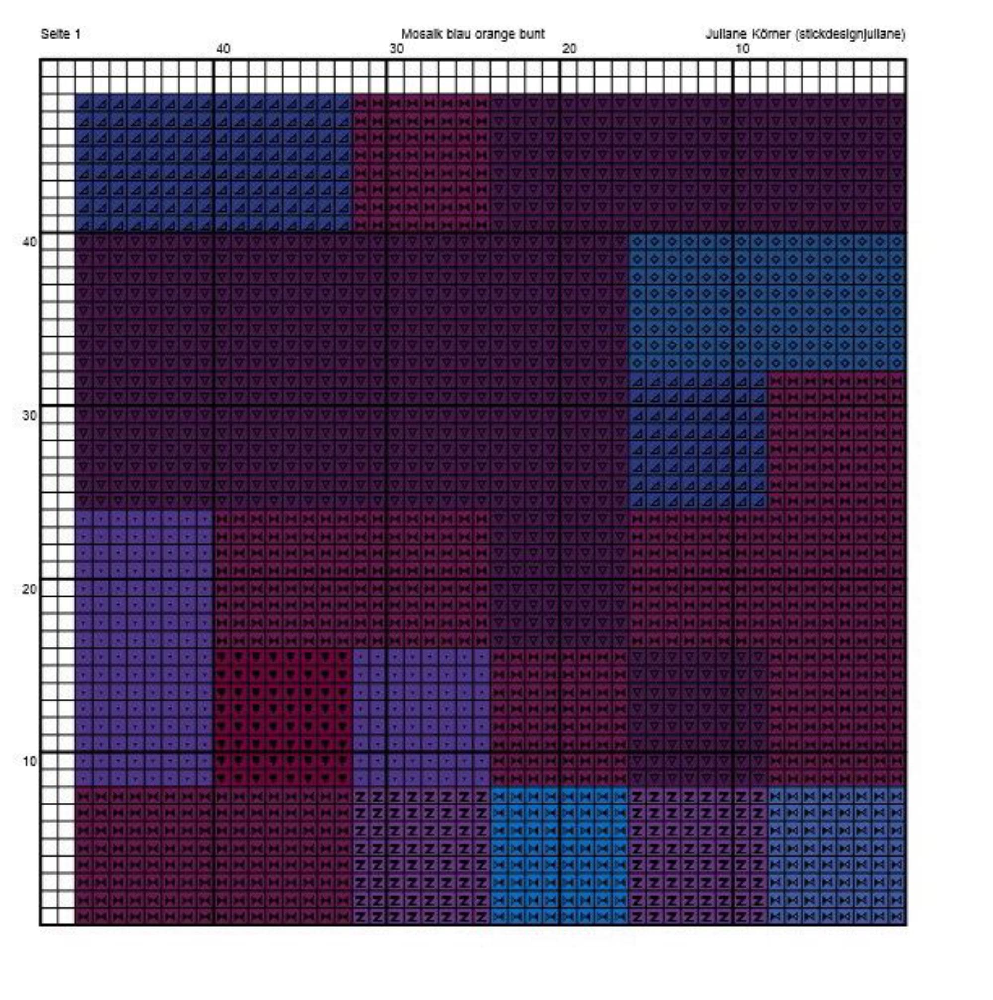 Small orange and blue mosaic in cross stitch. Each mosaic tile consists of 8x8 cross stitches. The ideal pattern for relaxed stitching.