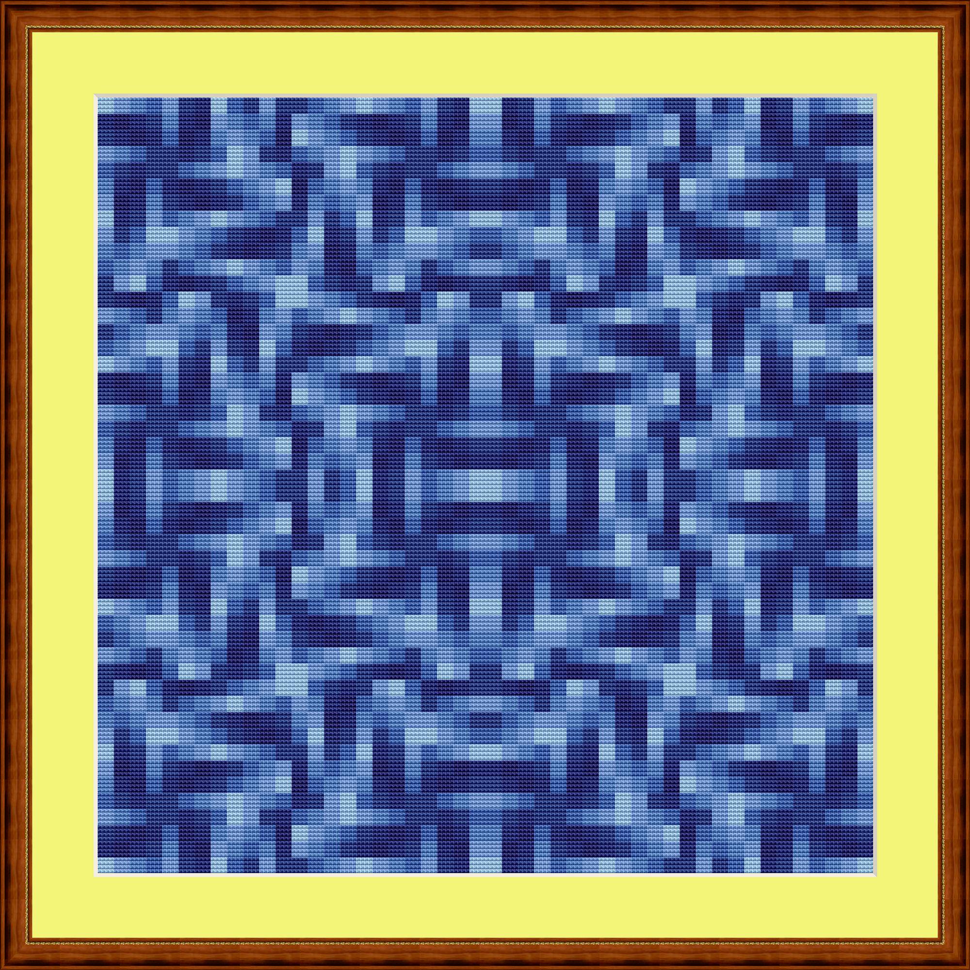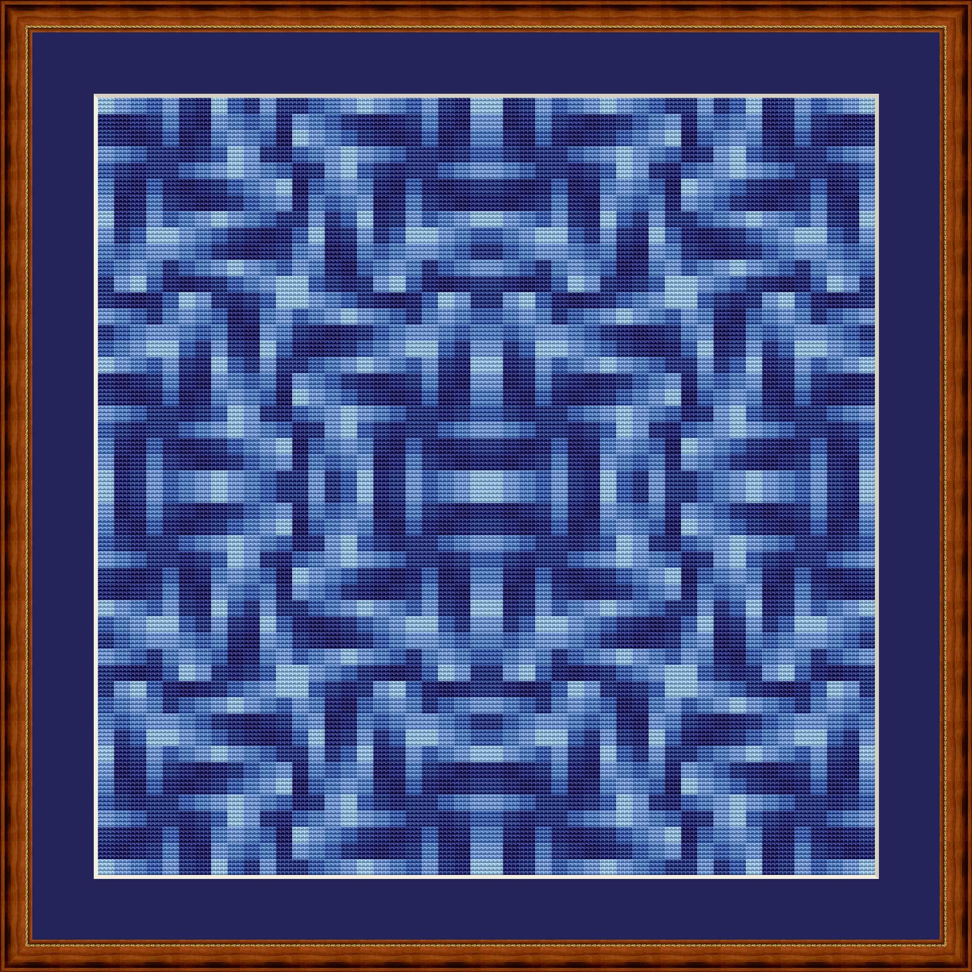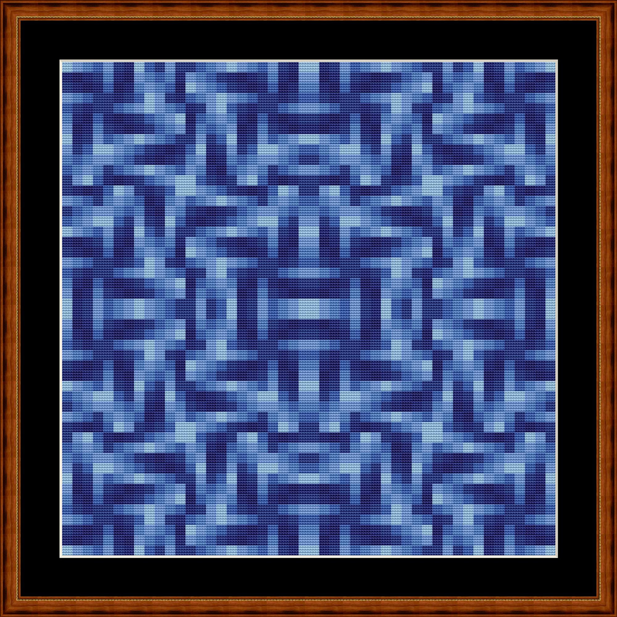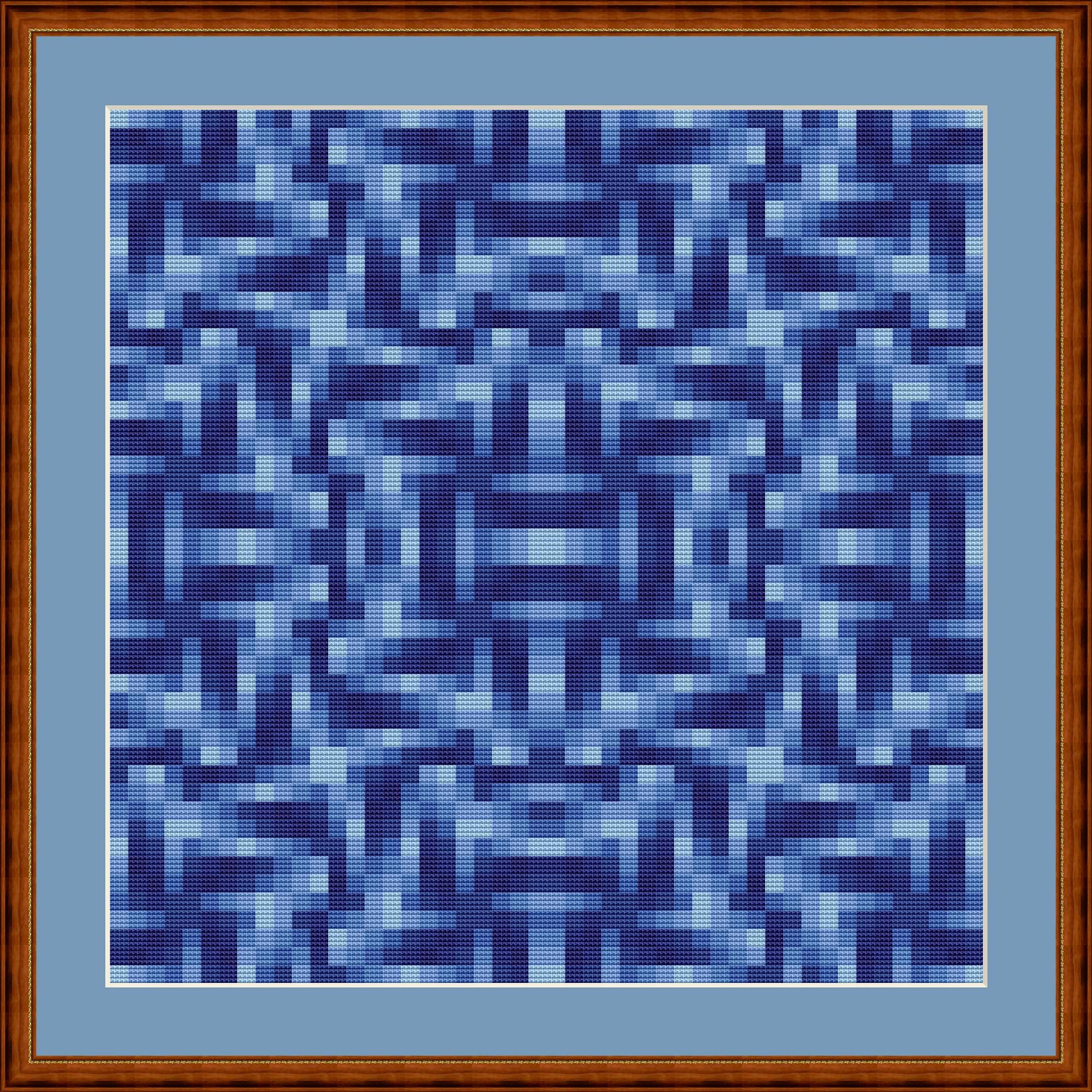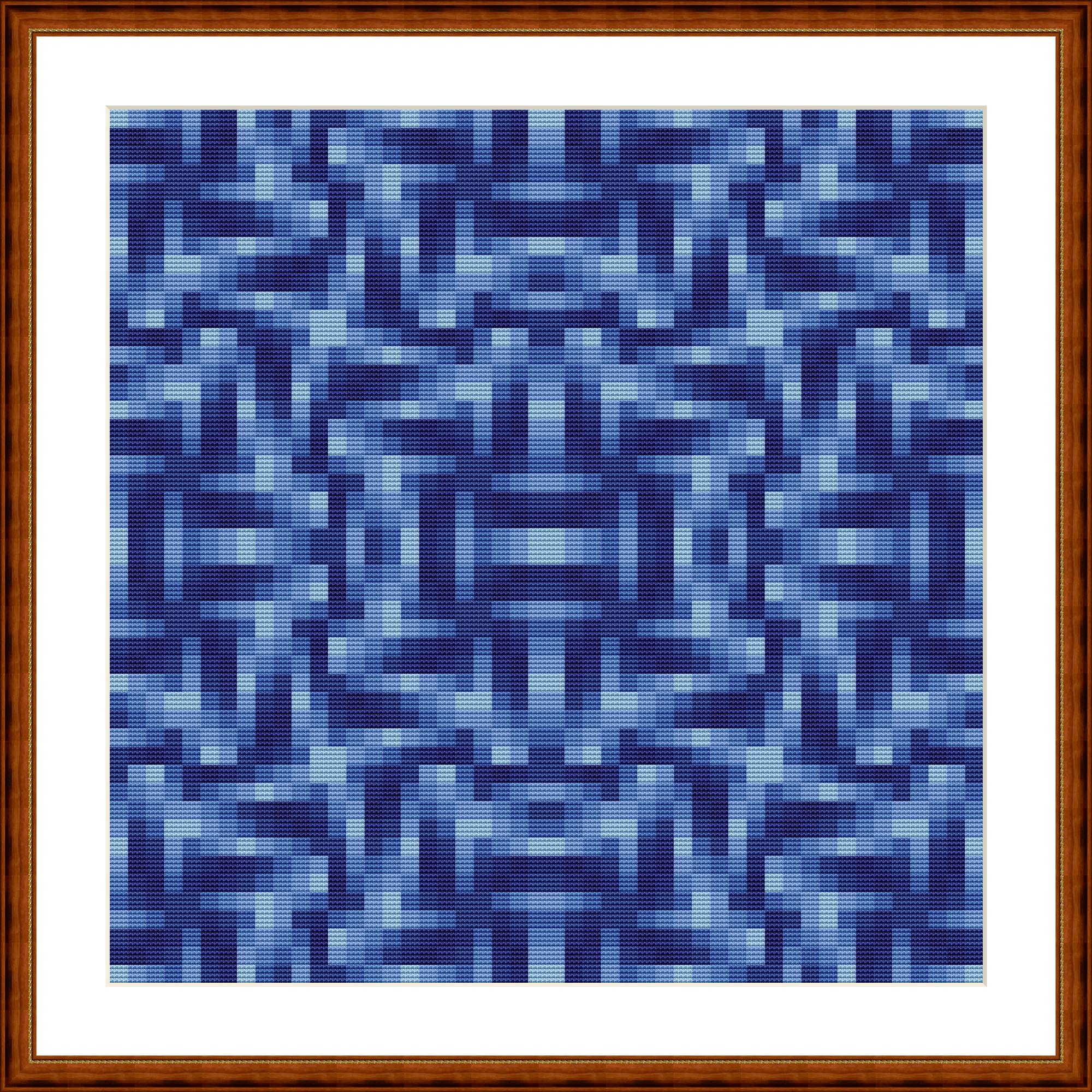 All blue. Mosaic using only 7 yarn colors. Each square consists of 4x4 cross stitches. Combined, they create a geometric pattern. Simply follow the stitching chart.