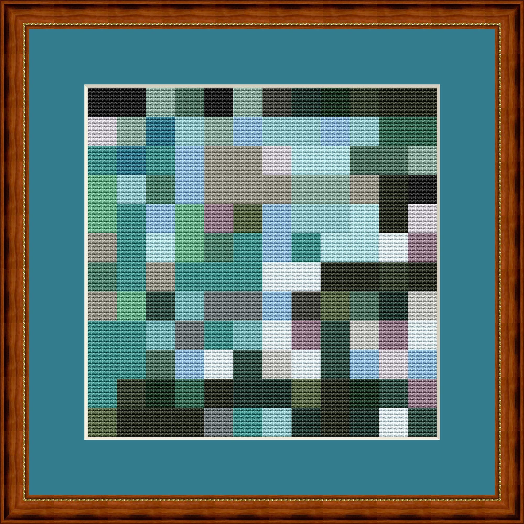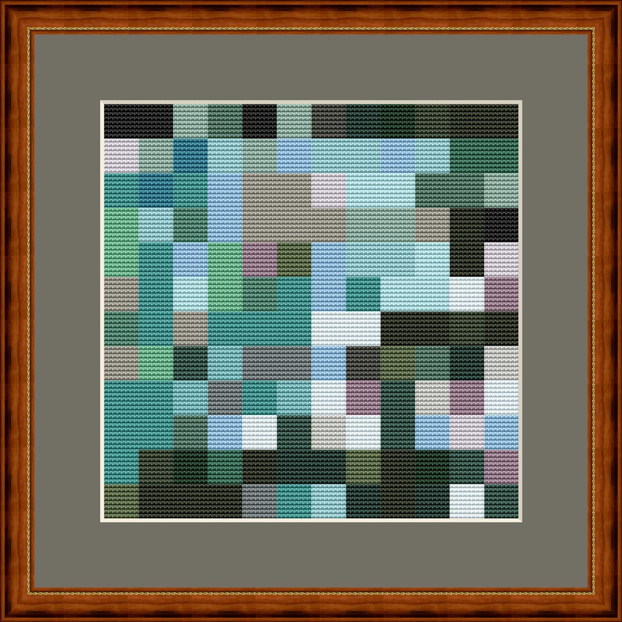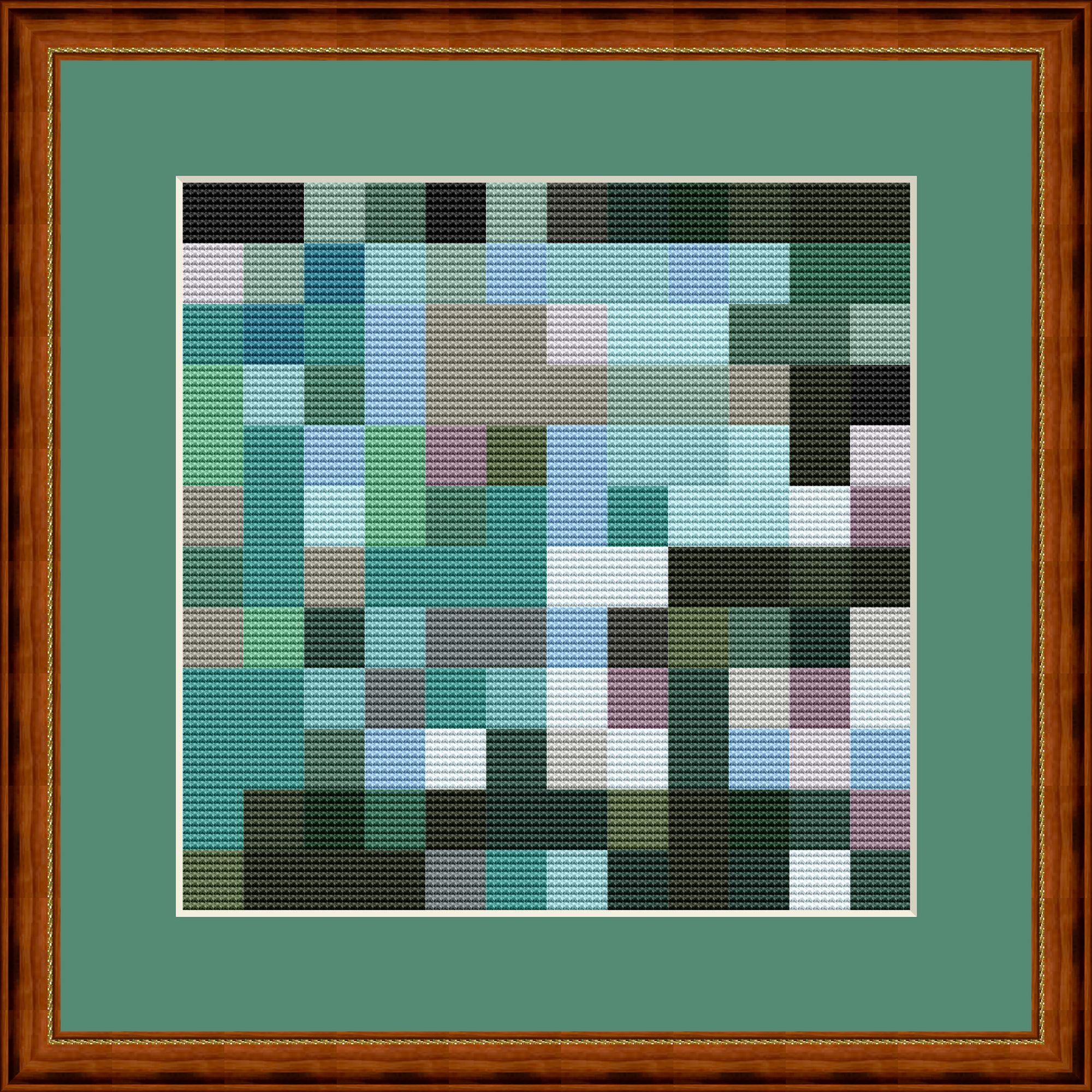 Small green and gray mosaic in cross stitch. Each mosaic tile consists of 8x8 cross stitches. The ideal pattern for relaxed stitching. This is mosaic number 3 in this color combination. More are available, all using the same DMC color numbers.