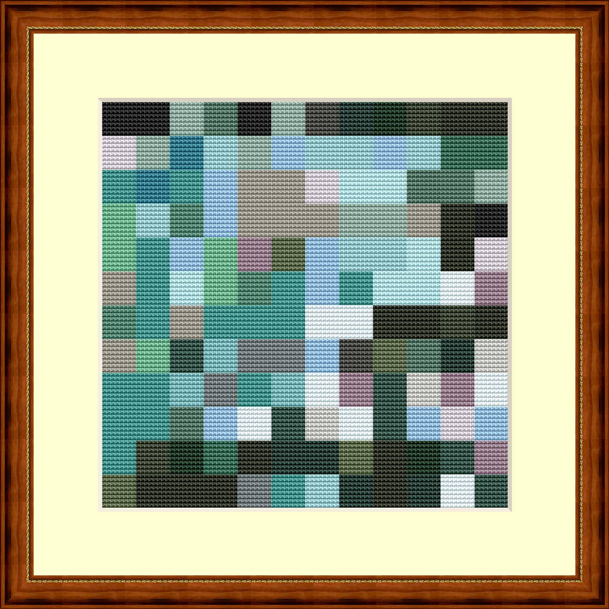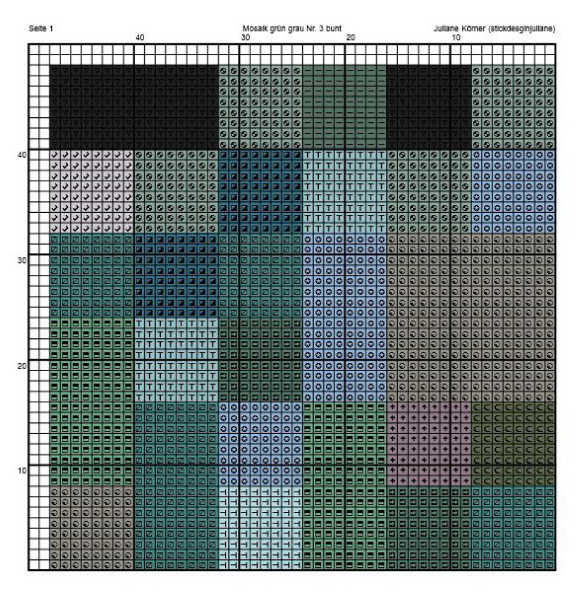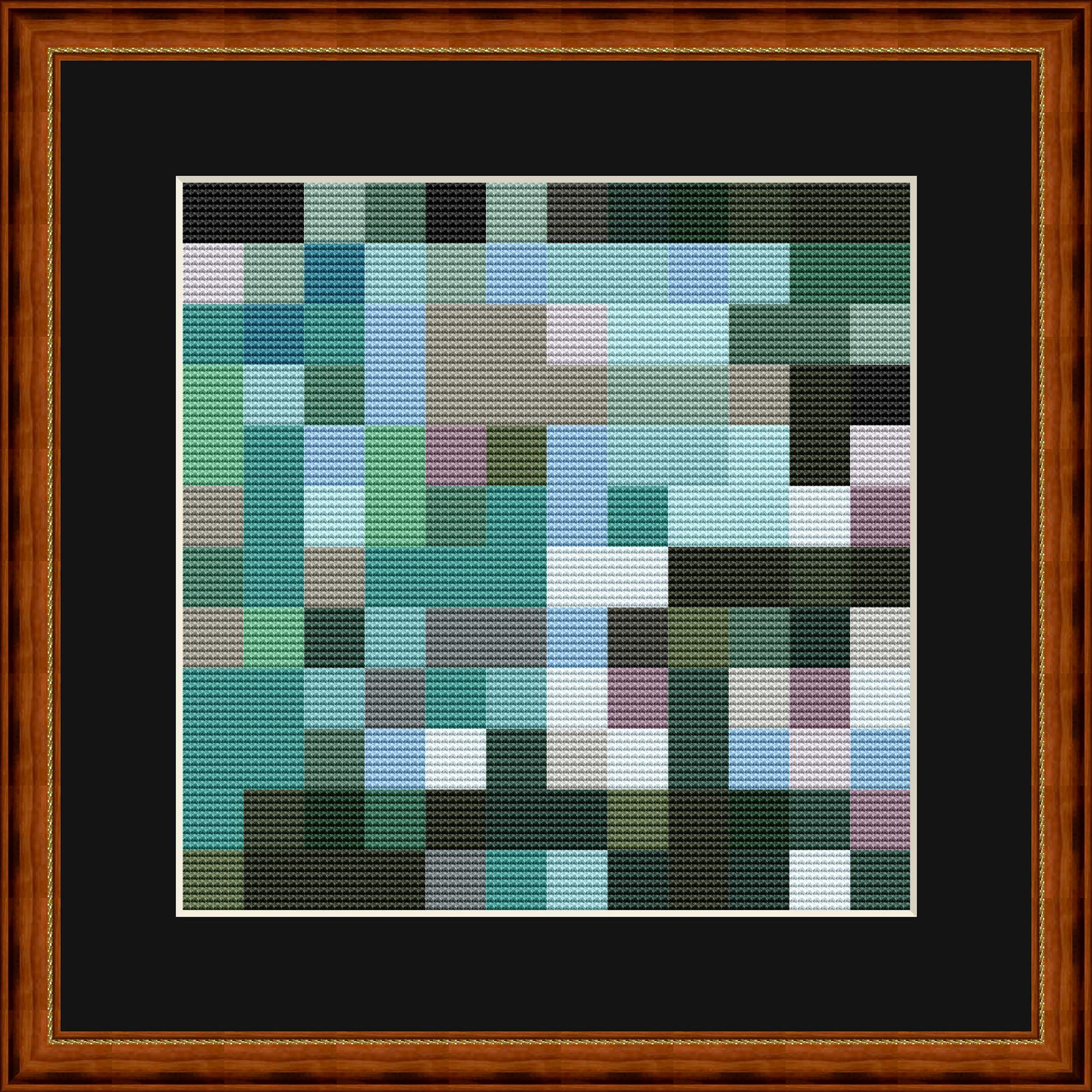 Small green and gray mosaic in cross stitch. Each mosaic tile consists of 8x8 cross stitches. The ideal pattern for relaxed stitching. This is mosaic number 3 in this color combination. More are available, all using the same DMC color numbers.